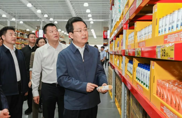 图为市委书记胡斌(右)在统泰一网超市总部园区批发仓储基地实地检查供应链仓储销售中心“1 号仓”项目运营情况及节日市场供应、消防安全等情况 李显鹏/图