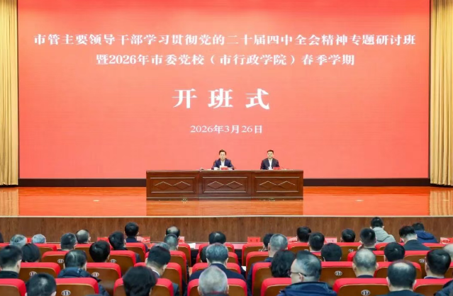 3月26日,市管主要领导干部学习贯彻党的二十届四中全会精神专题研讨班暨2026年市委党校(市行政学院)春季学期举行开班式。市委书记胡斌出席并作辅导讲话。他强调,要深学细悟习近平总书记在省部级主要领导干部专题研讨班上的重要讲话精神,深入学习贯彻党的二十届四中全会精神和全国两会精神,认真落实省管主要领导干部专题研讨班要求,以实干实绩实效答好政绩观“三问”,加快建设形神兼备的新时代省域副中心。市长王吉主持开班式。市人大常委会主任刘立新、市政协主席李富民出席开班式。