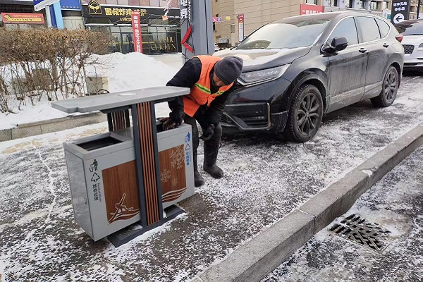 聚焦道路积雪积冰、雪堆占道等问题,区住建局采取“人机结合”协同作业模式,高效推进清除工作,重点对辖区内主次干道、人行道、公交站台、停车位等区域的积雪积冰及路面残留雪堆进行集中清理。同时,组织人员对果皮箱进行全面擦拭和维护,及时清运箱内垃圾,切实提升辖区环境洁净度。