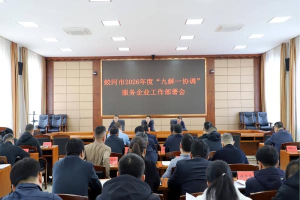 近日,蛟河市召开2026年度“九解一协调”服务企业工作部署会议。蛟河市委书记靳明,蛟河市委常委、组织部部长孙继亮,蛟河市副市长陈连波,各相关部门、乡镇街区主要负责同志参加会议。